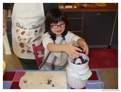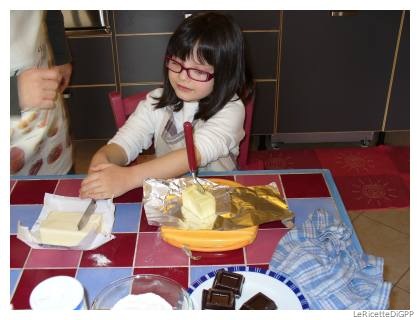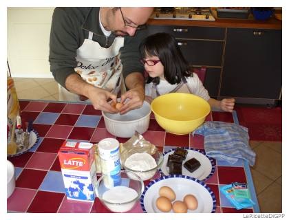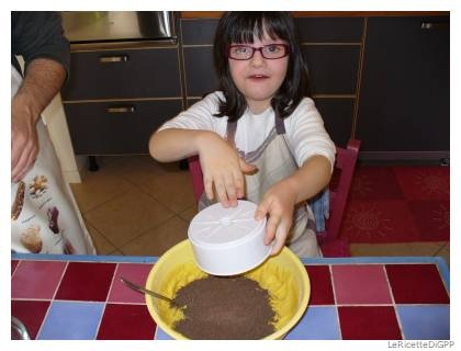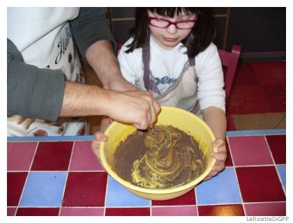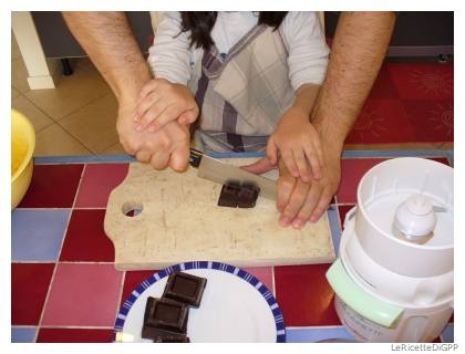Ora spezzettiamo grossolanamente il cioccolato e poi riduciamo a polvere con il tritatutto. Lo aggiungiamo all'impasto e mescoliamo con un cucchiaio: