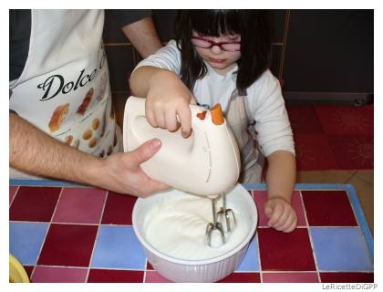 Ora l'ultimo passaggio, dobbiamo montare a neve ben ferma gli albumi che abbiamo precedentemente separato, aggiungendovi un pizzico di sale per facilitare l'operazione: