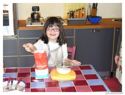 Aggiungiamo tutto lo zucchero ai tuorli e montiamo con lo sbattitore elettrico finchè non saranno diventati chiari e spumosi: