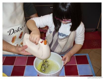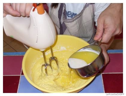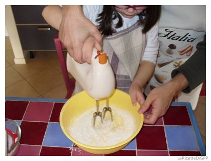 Adesso aggiungiamo metà della farina, setacciandola con un colino, ed incorporiamola con lo sbattitore: